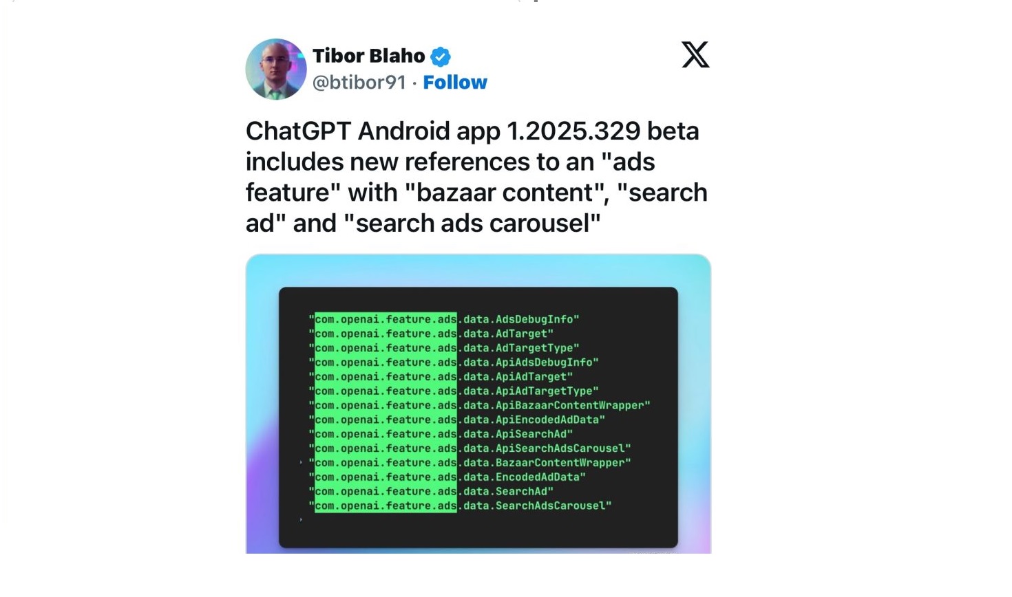 أظهرت تسريبات حديثة اختبار OpenAI إضافة إعلانات على تطبيق ChatGPT في نسخة الأندرويد التجريبية (1.2025.329)، وفقًا للحساب التقني على منصة إكس Tibor Blaho.